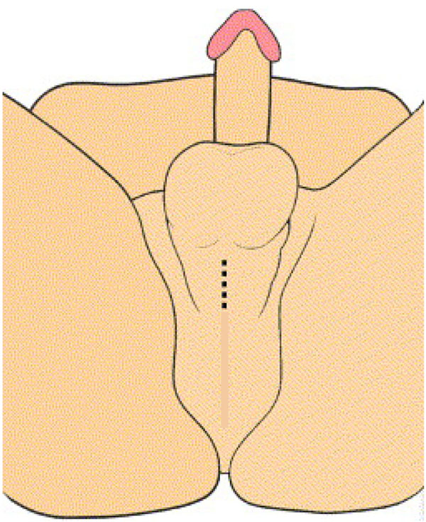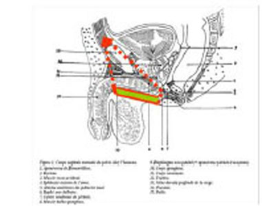 - A short transversal perinal incision or at the penoscrotal junction exposes the bulbocavernosus muscle and the median sagittal ligament which is dissected.