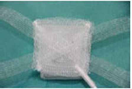 The second version Fig. (5) consisted of a pad in the shape of a bellows coated with polypropylene, thus replacing the windows at the edges and increasing the capacity for vertically guided expansion. The straps were made tubular in order to strengthen them and reduce their elasticity, but this caused difficulties for suprapubic fixation.