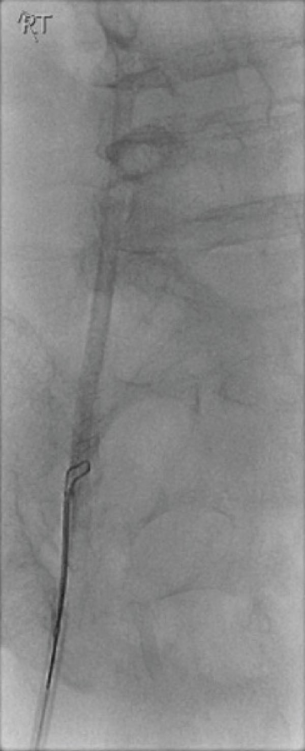 An urgent X-Ray revealed the catheter segment positioned in the superior vena cava (Fig. 1). The patient was transferred to the fluoroscopy suite and the severed segment of the catheter was retrieved using a snare device introduced via femoral vein (Fig. 2). There were no long-term complications.
